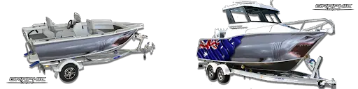 Ci-dessus deux exemple de bateau avec comme illustration le roi des mers. J’ai nommé bien sur le grand requin blanc. Les photos sont issues d’une société australienne de wrapping « GRAPHIC WRAPS ».