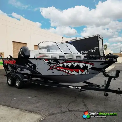 Voici un exemple de bass boat Tracker V-18 2017 conçu et installé par Gecko Wraps à Las Vegas. Un bon wrapping simple est efficace comme on les aime.